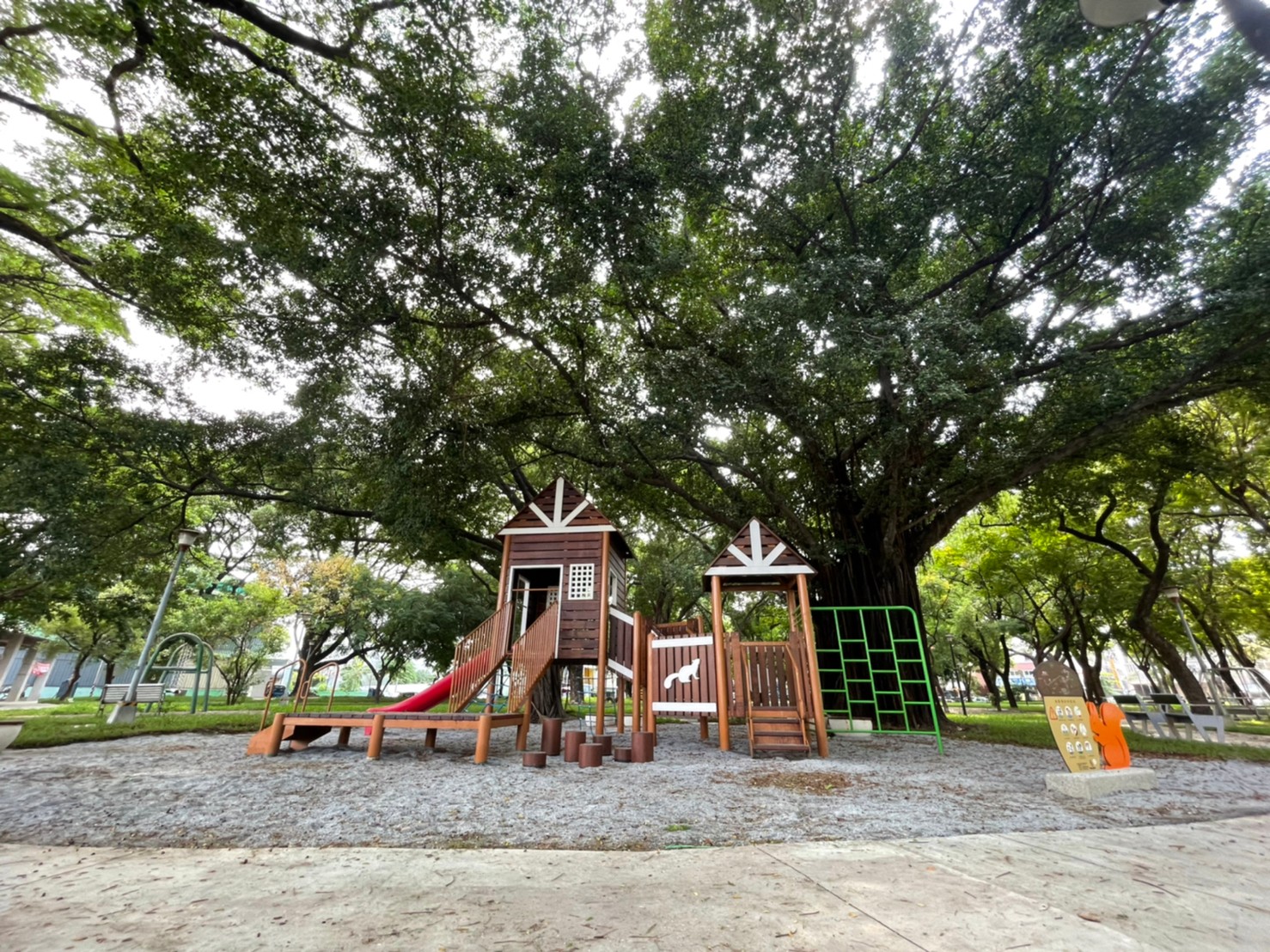 2.苓雅區福安公園遊戲場以樹屋為設計核心,將原本的設施整修為樹屋造型的大型複合式遊具,並搭配沙地增加安全性,讓孩子放心地追趕跑跳碰。