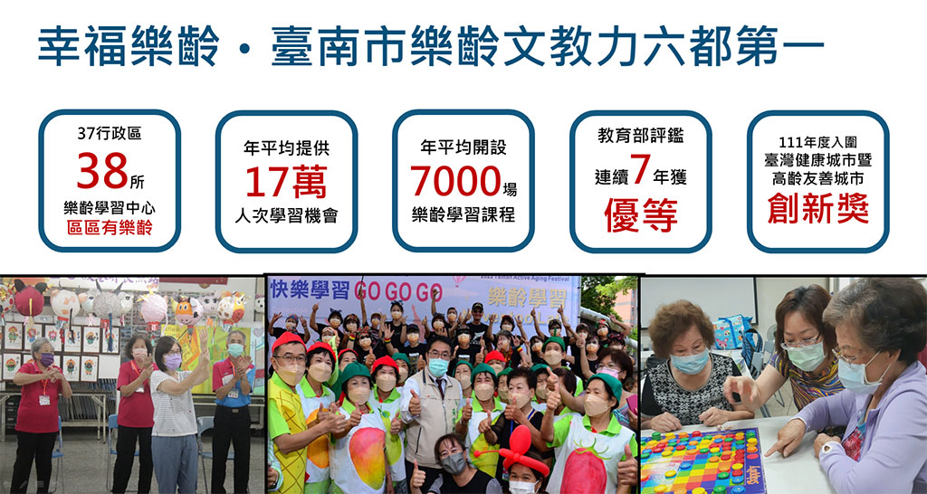 臺南市政府教育局鄭新輝局長表示,樂齡教育課程主要針對55歲以上樂齡市民設計,除開設教育部訂定的樂齡五大領域「核心課程」外,還有結合在地文化並兼顧民眾需求的「自主規劃課程」,以及培育志工、強調社會參與,實現老人照顧老人的「貢獻服務課程」。不讓學校「停課不停學」專美於前,樂齡學習中心創新經營設計線上影片課程,面對嚴峻疫情,仍能維持每年開設超過七千場次課程,而臺南樂齡教育更是連續7年獲得教育部評鑑優等。
