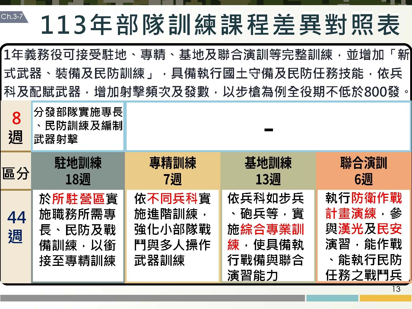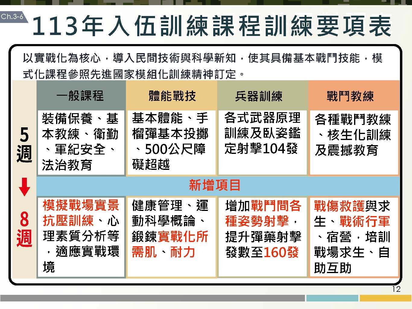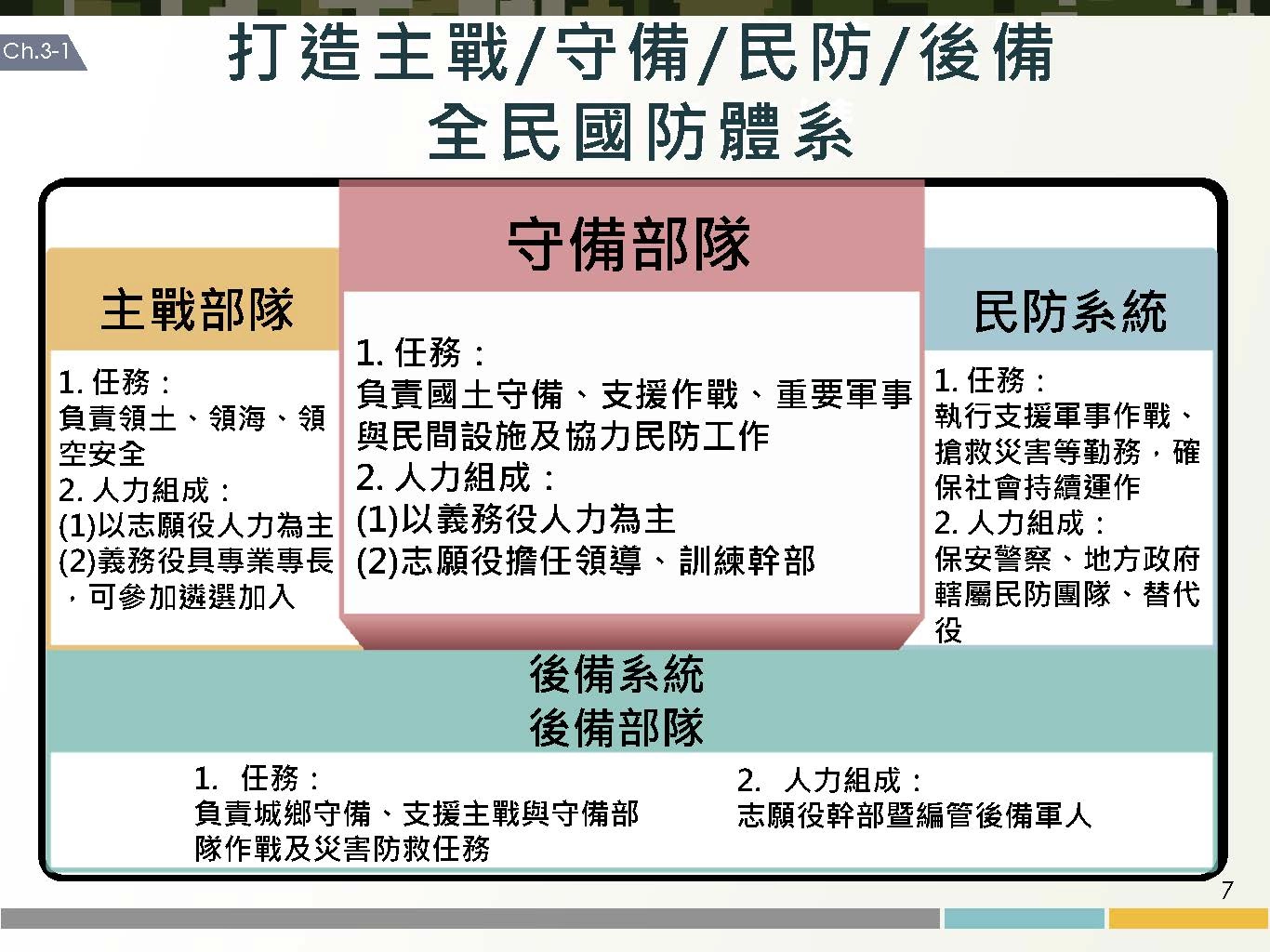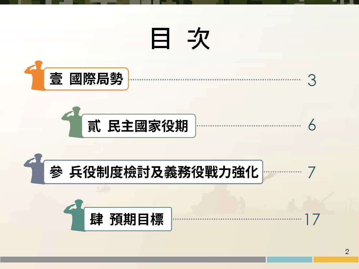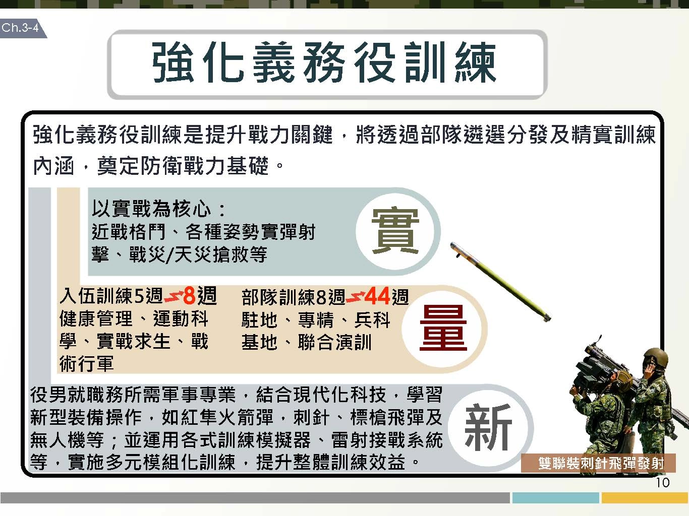 兵役延長議題受到社會各界關注,總統蔡英文今(27)日召開「強化全民國防兵力結構調整方案」記者會,正式宣布2024年起恢復義務役役期為一年,國防部副部長柏鴻輝也在記者會中詳細報告方案內容,包括役期調整的具體規劃、義務役訓練的訓練要項以及相關配套措施,國防部也推出「5分鐘帶您了解義務役役期調整」的圖卡,以簡潔明瞭的方式來向社會大眾宣傳。