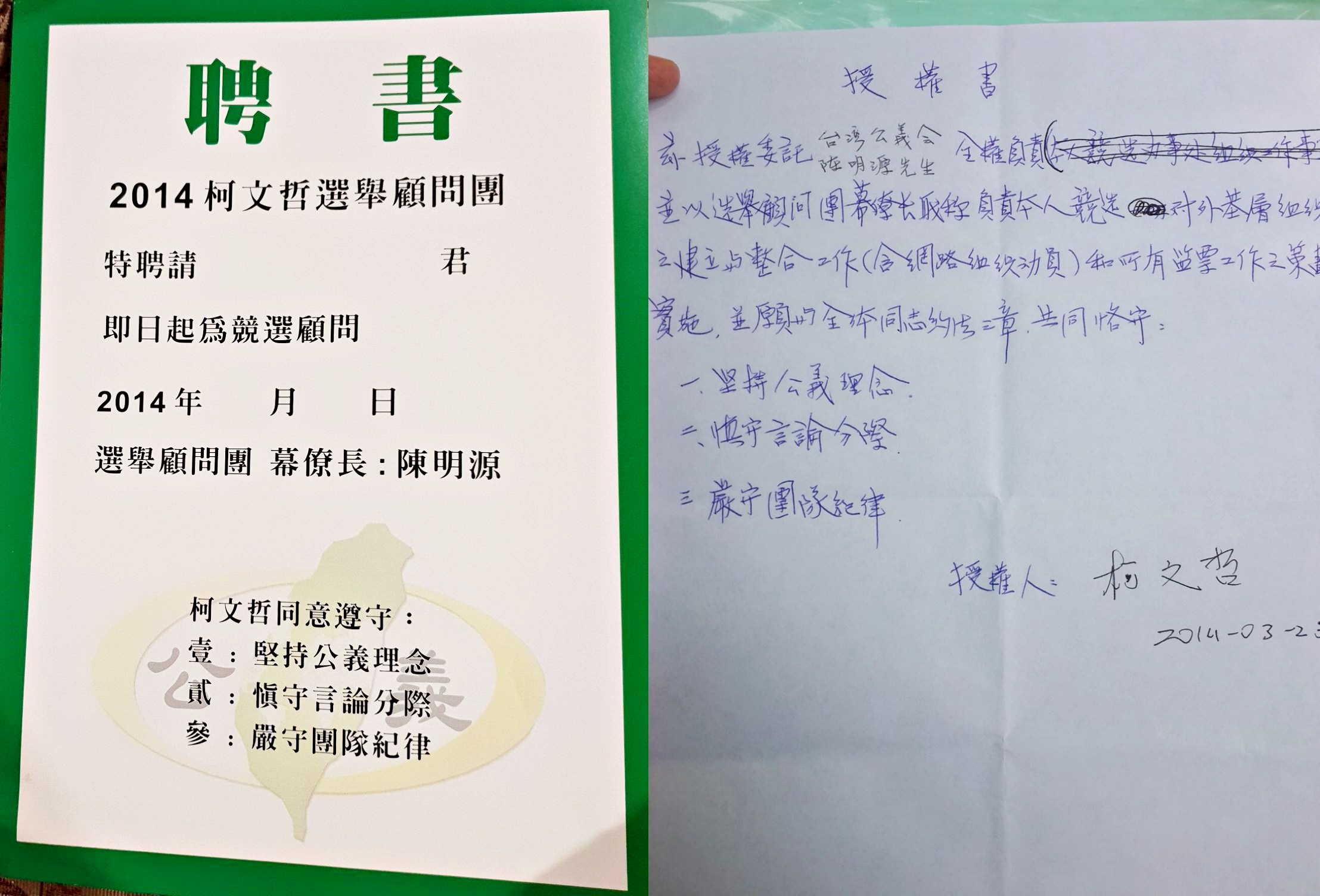 擔任「可憐密使」的柯營代表,是「台灣公義會」執行長陳明源醫師。他是最早促使柯文哲參選台北市長的人士。在選局逐漸明朗後,柯文哲給他的頭銜是:「選舉顧問團幕僚長」,執掌是:「全權負責對外基層組織之建立與整合工作,含網路組織動員,和所有監票工作之策劃實施。授權人:柯文哲2014年3月23日。」(如附件)