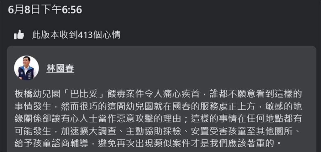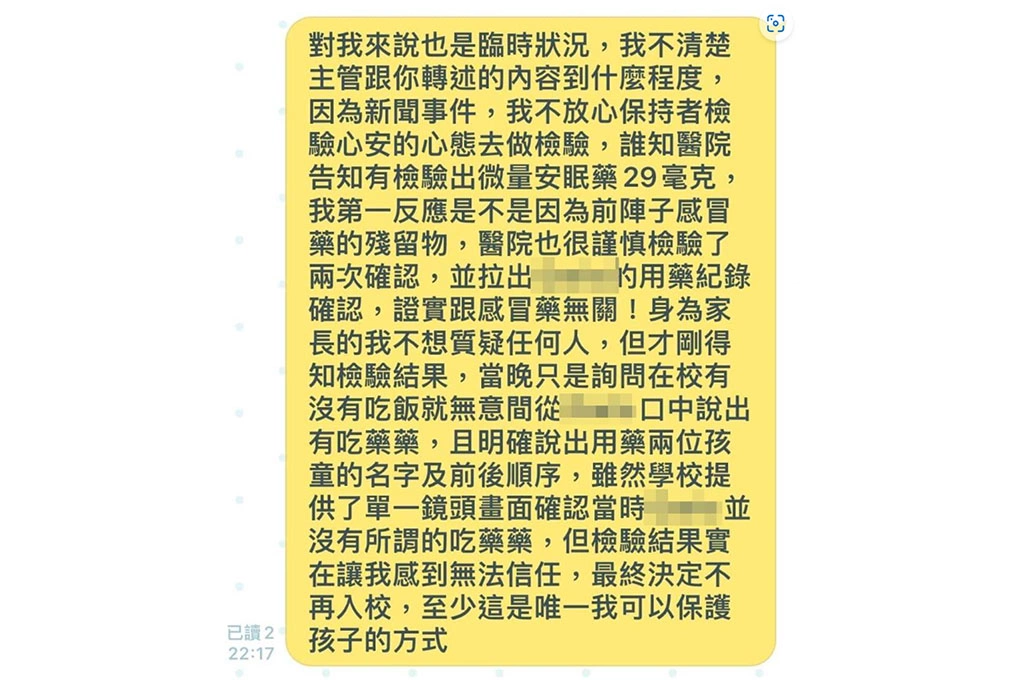 再者,該幼兒家長的貼文中顯示,幼兒在校有「吃藥藥」(被餵藥),幼兒園卻只提供「單一鏡頭」的監視畫面,看不到「吃藥藥」,無法讓家長信任。