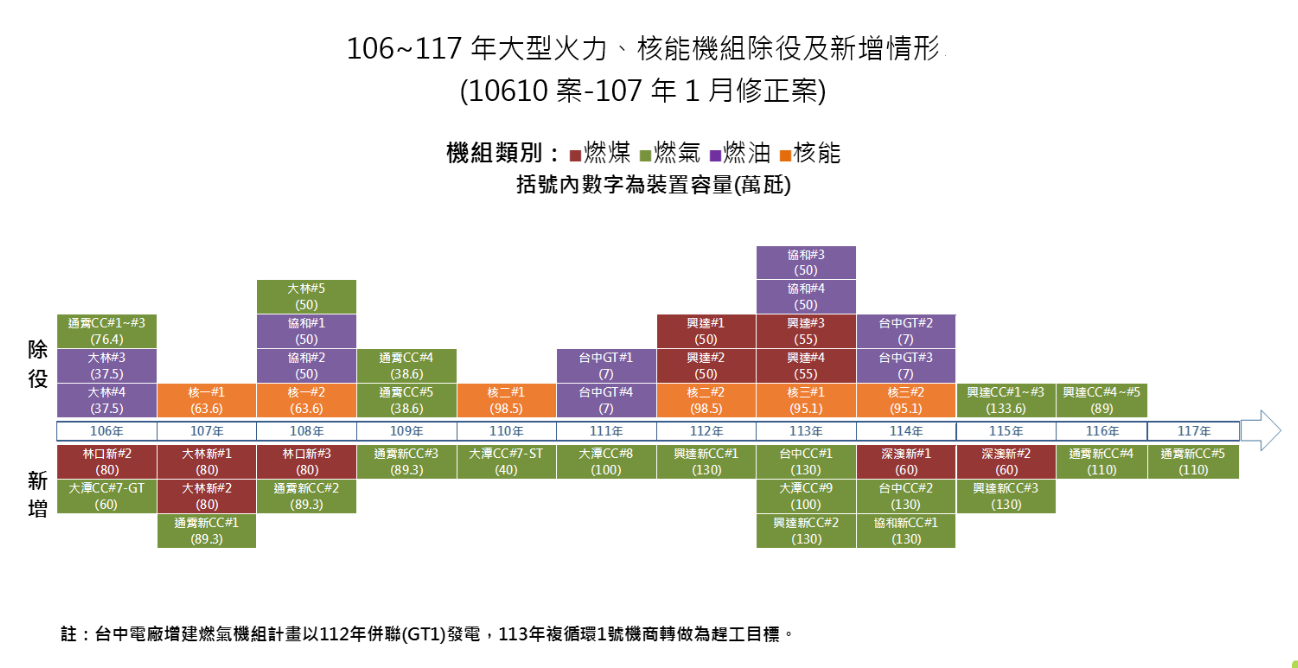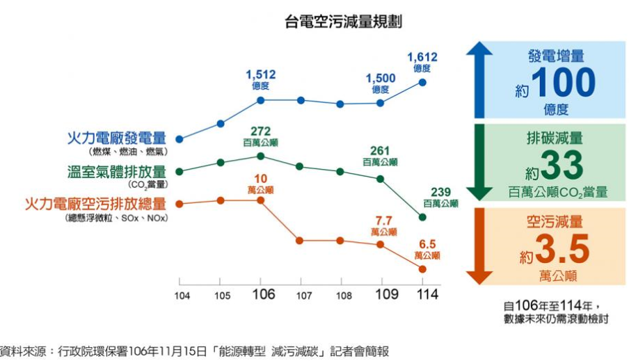 台電公司由106年至114年,預估發電量將增加100億度,但因發電結構調整及空污改善成果,空污排放量預估由10萬噸左右,降低至6.5萬噸,減幅達35%;兼顧供電穩定與環境保護。