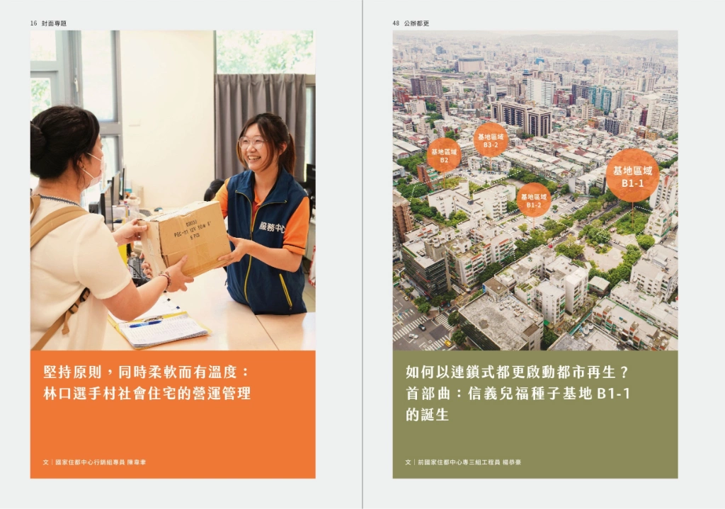 本期更深度報導近年公辦都更代表案例,包含國內第一個連鎖式都更種子基地「信義兒福B1-1案」的啟動,以及透過都市更新重新定義社會住宅型態的南港玉成案,更完整呈現榮獲2023年紅點設計獎「品牌與傳達部門獎」的嘉興街公辦都更《海馬迴實驗計畫》。