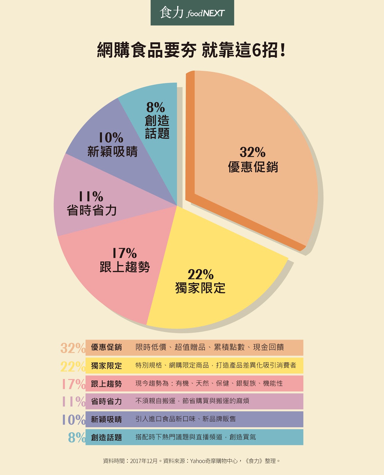 根據Yahoo奇摩購物中心統計,網購食品能熱賣的秘訣可分為6大原因,分別為優惠促銷、限定獨家、跟上趨勢、省時省力、新穎吸睛及創造話題。其中,除了比價與下單省時,運送省力不需自己出門的通路特性之外,食品業者若針對剩下的5大秘訣做因應對策,便可提升通路業者對於自己的需求。