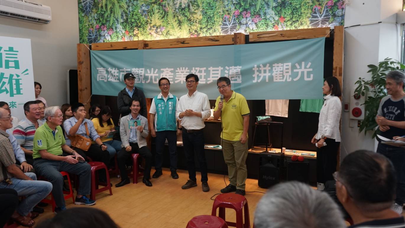 民進黨高雄市長候選人陳其邁,12日下午出席在市民總部舉辦的高雄市「觀光產業挺其邁」拚觀光座談會。現場擠進三十幾家、近兩百名觀光業者,讓會場寸步難行,陳其邁到場後受到大家熱烈鼓掌歡迎,顯示其高人氣。陳其邁表示,感謝旅行公會及遊覽車公會業者在百忙中站出來力挺,他一定會扮演好高雄頭號推銷員的角色,帶領業者將高雄在地之美及文化行銷全世界。