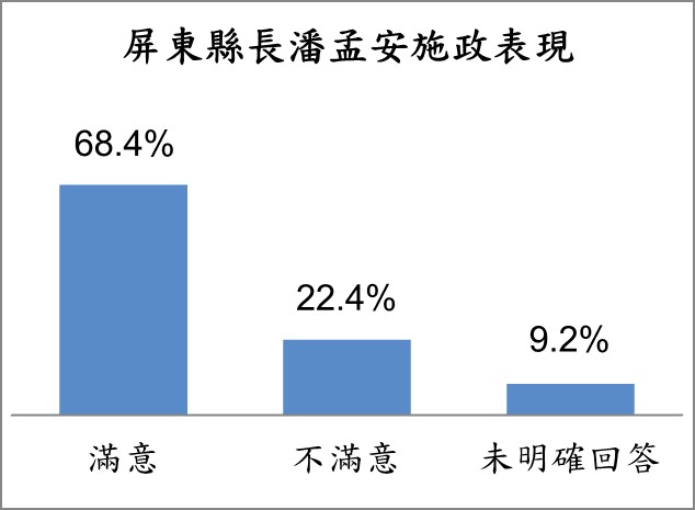 在現任縣長潘孟安的施政表現中,有68.4%的民眾對於其四年來的施政績效表達肯定支持,給予滿意之評價,另有22.4%不滿意,以及9.2%的未明確回答。