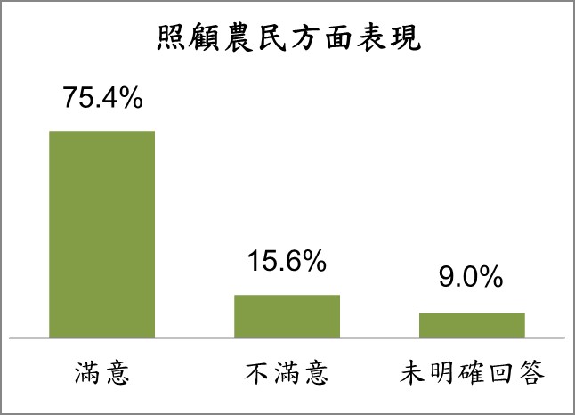 針對屏東縣政府積極推動農業保險及農民職業災害保險,提供農民更多保障。有75.4%受訪民眾對此表示滿意縣府照顧農民的表現,15.6%不滿意,9.0%未明確回答。