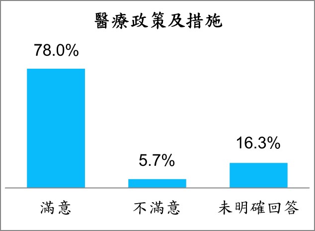 有78.0%受訪民眾滿意縣府推動醫療相關政策及措施,5.7%不滿意,16.3%未明確回答。