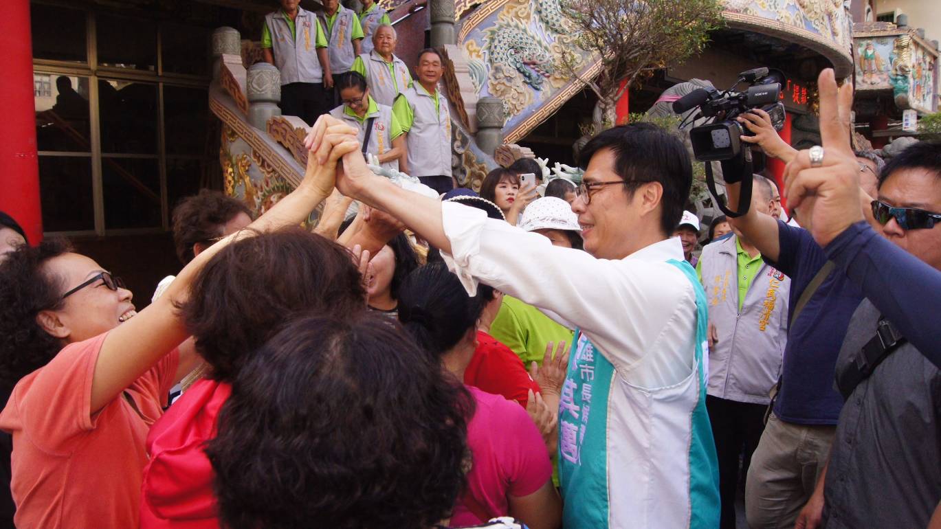 陳其邁的車隊掃街行程,以各地區廟宇串連起車隊掃街路徑,因為廟宇往往是地方鄉親聚集的地方,陳其邁競選車隊早上從覆鼎金保安宮出發,途經本館龍池宮、寶珠溝褒忠義民廟參拜,下午從仁武出發,經仁武福清宮、八卦北極宮、赤山慈惠堂、灣內代天府,接著馬上來到鳥松瑯環宮、保民宮、大樹北極殿,再來到大社保元宮、青雲宮參拜,祈求選戰最後能勝出,高雄未來風調雨順。
