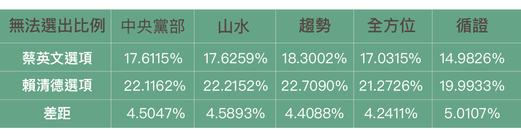 在同一題選項的三個候選人,把三位的支持率數字加總,可以得出三人總得票數比例,剩下的就是「無法選出或都不支持」的比例,如下表。可以看得出,在蔡英文選項的題目裡,不表態的比例都比在賴清德選項的題目還要低,也就是,當選項有賴清德時,棄選的比例平均約高4.55%。這可以視為蔡陣營在宣傳「唯一支持」上的成功,但賴清德陣營也用相同方式宣傳,所以若這兩方面相互抵銷,那很顯然不是雙方的「空軍」戰力有顯著差異,就是這些選票確實有非小英不投的傾向。
