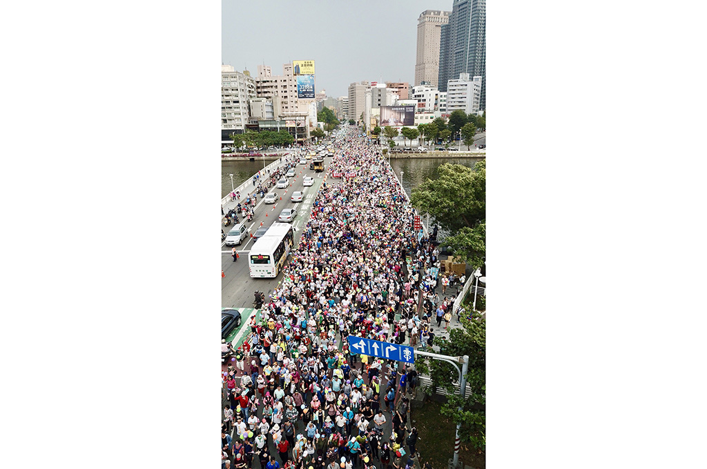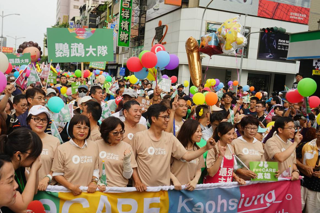 民進黨高雄市長候選人陳其邁17日參與Wecare高雄大遊行,徒步走完全程。他表示,會有這麼多市民站出來,就是要展現愛與和平的力量,拒絕抹黑、造假、霸凌,這是大家無分政治立場,一起挺高雄、支持台灣的民主。