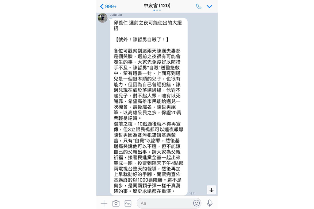 此外,近日在Line群組瘋傳【號外!陳哲男自殺了!】貼文,虛構杜撰了候選人陳其邁的父親會在選前之夜以自殺的方式,來博取選民同情影響選舉結果,這根本就是假消息,而且是極不道德的以候選人至親的生命做抹黑、造謠手段,令人不齒。