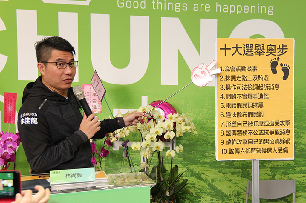 林佳龍競總發言人林尚賢說,競選至今已看到全國很多縣市選舉都有負面宣傳或抹黑攻擊的情事發生,已經造成社會對立及引導輿論風向,相當令人擔憂,常見的「十大選舉奧步」包括晚會活動滋事、抹黑走路工及賄選、操作司法檢調起訴消息、網路不實爆料造謠、電話假民調抹黑、違法散布假民調、形塑自己被打壓或遭受攻擊、謠傳選務不公或抗爭假消息、散佈攻擊自己的黑函真嫁禍、謠傳六都藍營候選人受傷等不實訊息。