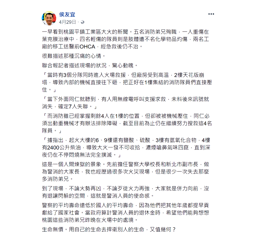 (圖片:侯友宜對於敬鵬大火感想。截圖自侯友宜 Facebook「侯友宜」)