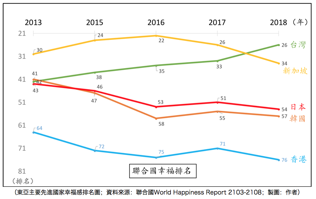 從聯合國幸福感報告有國家排名以來,我取台灣、韓國、日本、新加坡、香港的數字,如下表與圖。