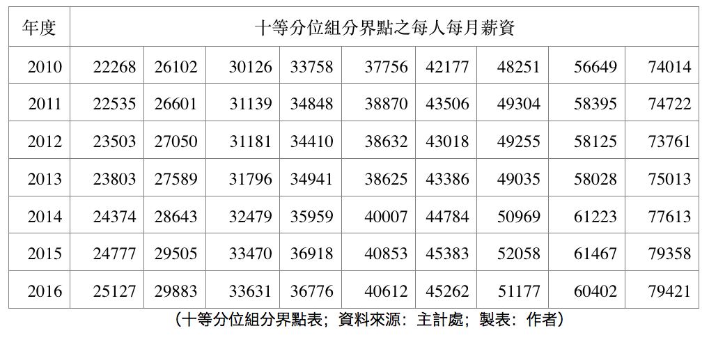 從表跟圖都可以看出來,越低薪的人,薪資成長幅度越大。這不是說台灣的貧富差距縮小,因為有錢人是靠錢在賺錢,不是靠薪水。這個圖是在說,