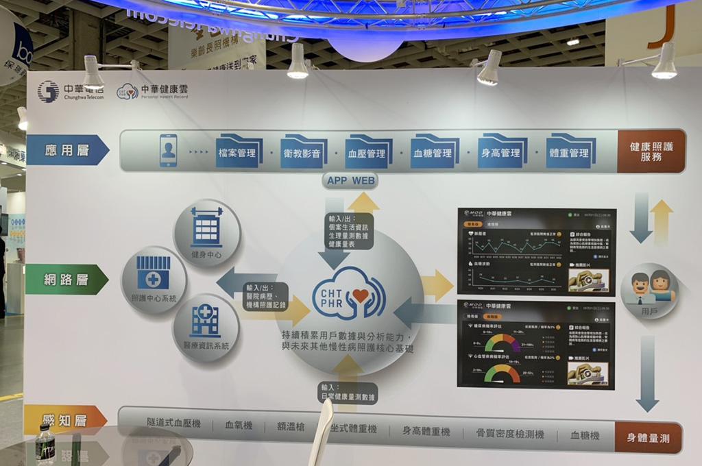 考量到國內老年、慢性病患人數不斷增長,在醫療資源有限的情況下,智慧照護的重要性逐漸提升,為提高診療效率,以及為自己與親友健康把關,中華電信推出「健康雲」服務,可將日常的血壓、血糖、體重等量測數據自動上傳雲端,讓民眾不但可以輕易追蹤數值趨勢變化,掌握自主健康管理外,還可在經過授權後,追蹤親友健康狀況,查詢方式僅須透過裝置行動APP、網頁及MOD即可觀看。需要時,專業人員也會提供即時的衛教諮詢,分析講解數據,並依照健康狀態推薦相關的衛教資訊影片。雲端上的數據也會與醫療院所同步,讓醫療人員能夠更快速地了解病情,減少浪費多餘成本與時間。