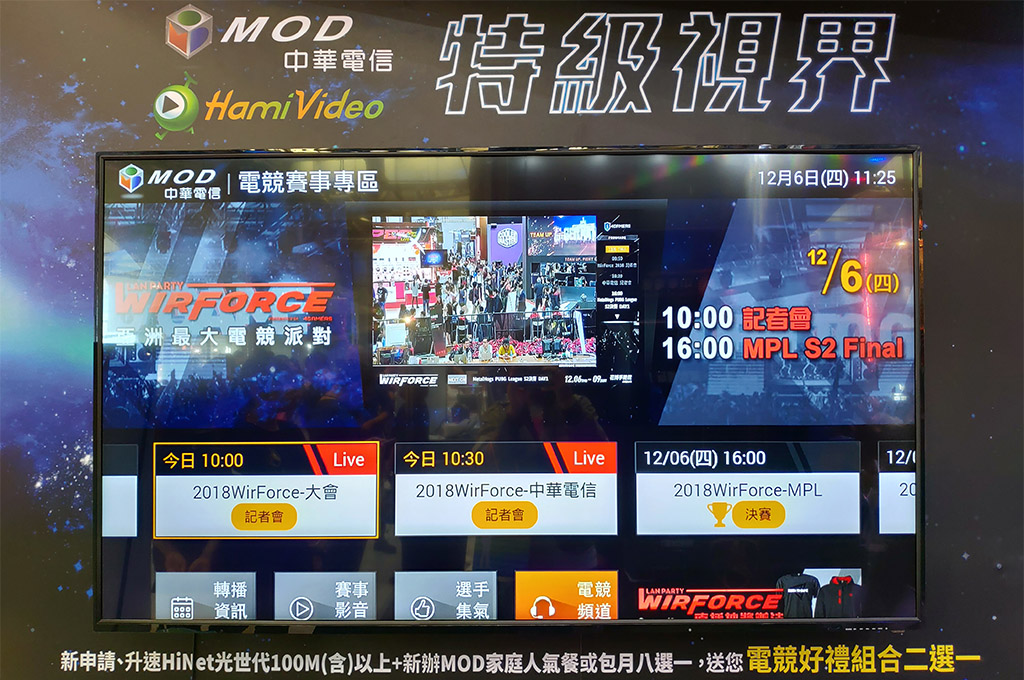 中華電信近年來積極投入電競產業,不僅轉播國內外重要電競賽事包含:「六都電競」、2017《英雄聯盟》世界大賽、等等…並走入校園舉辦「CHT Master中華電信校園電競賽」以及協助合作與舉辦「2018 IESF世界電競錦標賽」;此次中華電信也在Wirforce 2018活動期間,提供了Hami Video、MOD電競專區的超高畫質精采電競賽事轉播,讓玩家們在家中也可以享有超高畫質的賽事欣賞。