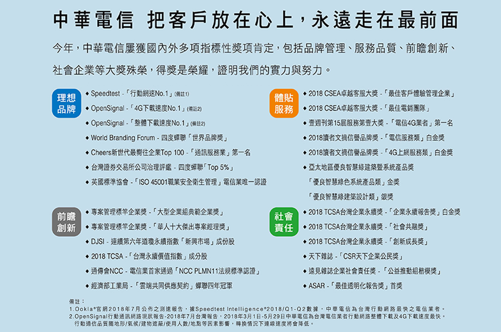 除了一貫的體貼服務使中華電信獲得2018 CSEA卓越客服大獎-「最佳客戶體驗管理企業」、「最佳電銷團隊」、壹週刊第15屆服務第壹大獎-「電信4G業者」第一名、2018讀者文摘信譽品牌獎-「電信服務類」白金獎、「4G上網服務類」白金獎等獎項外,在企業的前瞻創新上,也榮獲專業管理標竿企業獎-「大型企業組典範企業獎」、「華人十大傑出專案經理獎」、經濟部工業局-「雲端共同供應契約」蟬聯四年冠軍、DJSI-連續第六年道瓊永續指數「新興市場」成份股、2018 TCSA-「台灣永續價值指數」成份股,以及通過通傳會NCC-電信業首家通過「NCC PLMN11法規標準認證」。