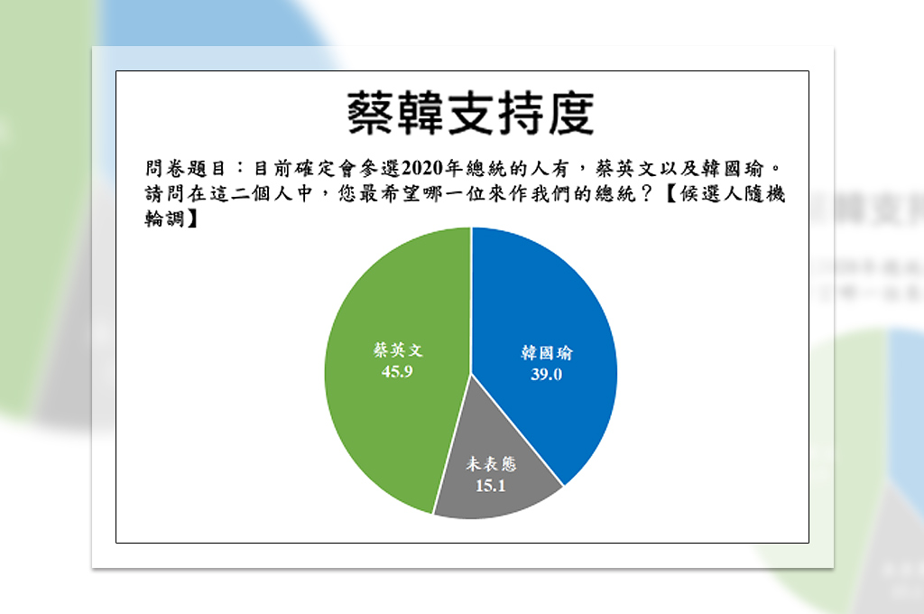 根據「兩岸政策協會」今日發布最新民調指出,蔡英文支持度45.9%,勝過韓國瑜(39.0%)6.9個百分點。國民黨初選民調才結束兩天,當中大幅領先的高雄市長韓國瑜民調就急遽下降?就民調與統計言,這種詭異現象當然不太可能瞬間發生。