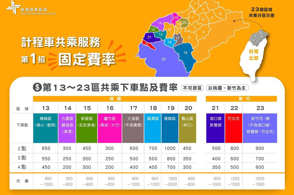 旅客在使用機場計程車共乘服務時,可依實際需求選擇「固定費率共乘」或「里程費率共乘」兩種計費方式,固定費率共乘旅客目的地限同一區域內,桃園機場特地規劃出23個旅客較常前往的區域,範圍涵蓋台北市、新北市、基隆市、桃園市、新竹縣、市等23個區域,收費依旅客下車地點數量,按照桃園市政府交通局核定的價目表收取固定金額。