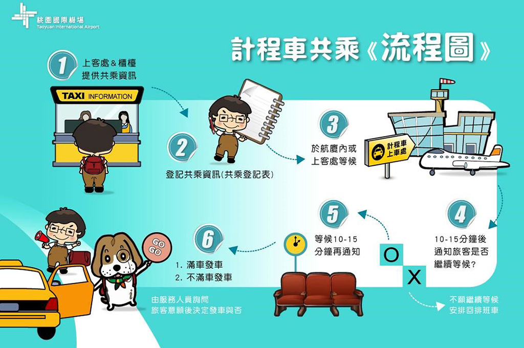 桃園機場為我國首要對外國際機場,為提供深夜往返旅客安全且省錢的交通接駁,推出機場排班計程車夜間共乘服務,時間為每天的凌晨0時至清晨6時,600輛計程車在機場第一、二航廈共乘站輪流排班,由服務人員媒合使用此服務,2人即可成行,最多可4人共乘,不但增添旅客的便利性、分攤車資降低負擔、有效提升運輸資源效率外,更達到節能減碳目的,可說一舉兩得。