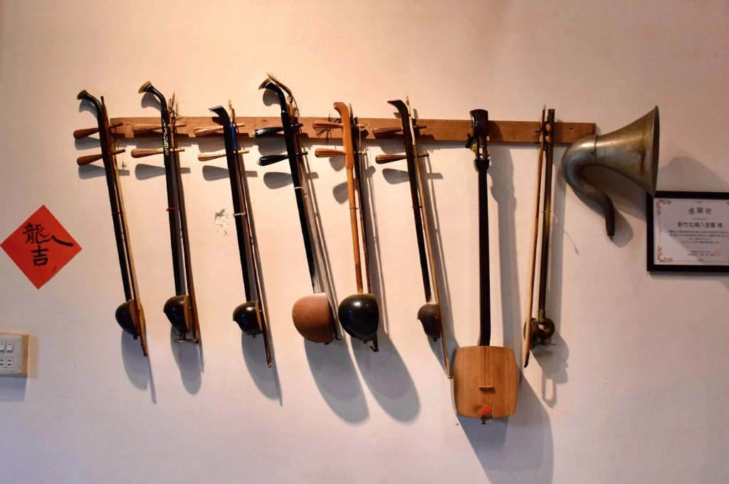 八音源自「金、石、絲、竹、匏、土、革、木」,圖中樂器牆展示了客家八音常用的傳統樂器,其中嗩吶是領奏的靈魂之音
