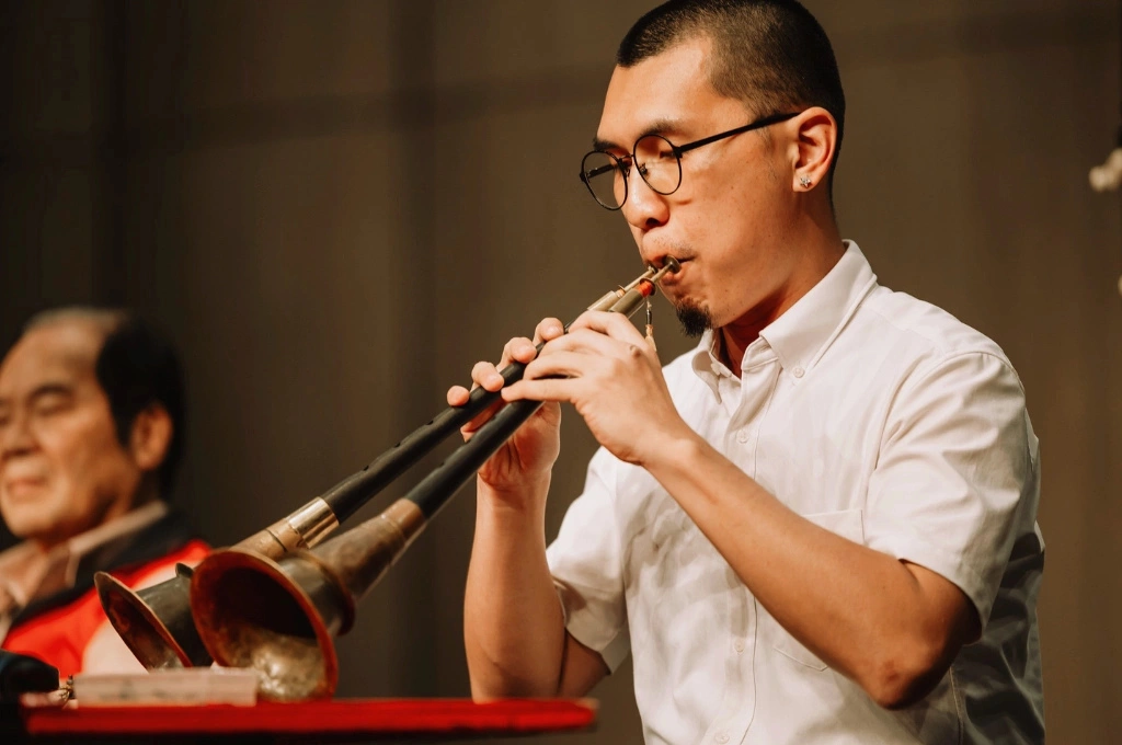 彭峻暘精通八音樂器,其中嗩吶技藝尤為出色,如今更能同時吹奏兩把嗩吶,將傳統演奏方式推向更高的藝術層次