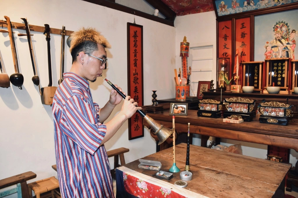 嗩吶聲響起的那一刻,他彷彿回到了童年廟會,站在阿公身旁,望著戲台上技藝高超的老師們,心裡默默許下一個願望:有一天,我也要吹出這樣的韻味。