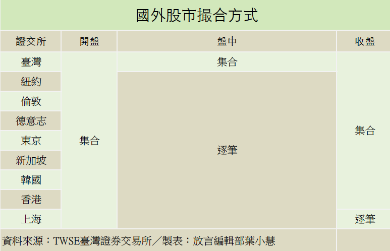 其實,國際各大股市如紐約、倫敦、東京、新加坡、香港、韓國、歐洲,盤中交易都是採取「逐筆交易」,唯獨台灣仍採取每 5秒撮合一次的集合競價。台股實施逐筆交易,是接軌國際市場的重要措施。