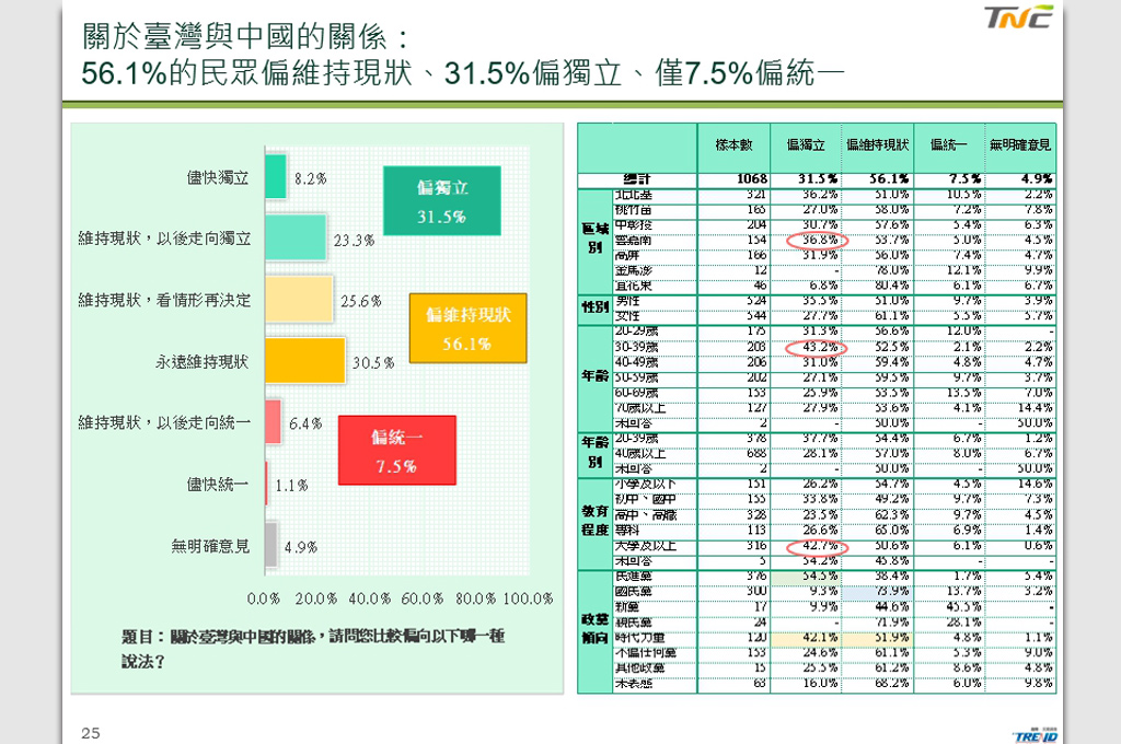 另外,關於台灣與中國的關係,有56.1%的民眾希望維持現狀、31.5%偏獨立、僅7.5%偏統一。本次民調委託「趨勢民調公司」執行,調查時間為8月1日至3日,採「分層比例隨機抽樣法」,市內電話調查完成1068份有效樣本,在95%信心水準下,抽樣誤差為正負3.0個百分點。