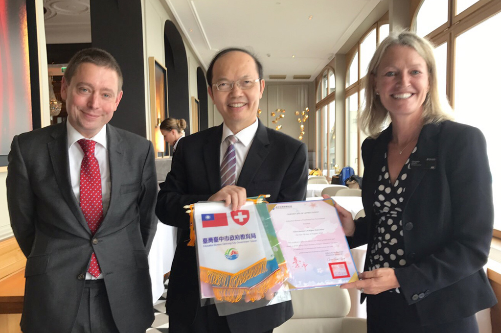 市府今年舉辦國際教育交流活動,打破過去校對校的交流方式,由教育局建立平台,以嘉惠所有台中市學生,盼提升台中教育的國際能見度,尤其此次不同過去與美國及加拿大等英語系國家交流,市府遠赴歐洲與瑞士學校合作,擴大其它語系國家,也成功與當地四所知名學校簽訂合作MOU。