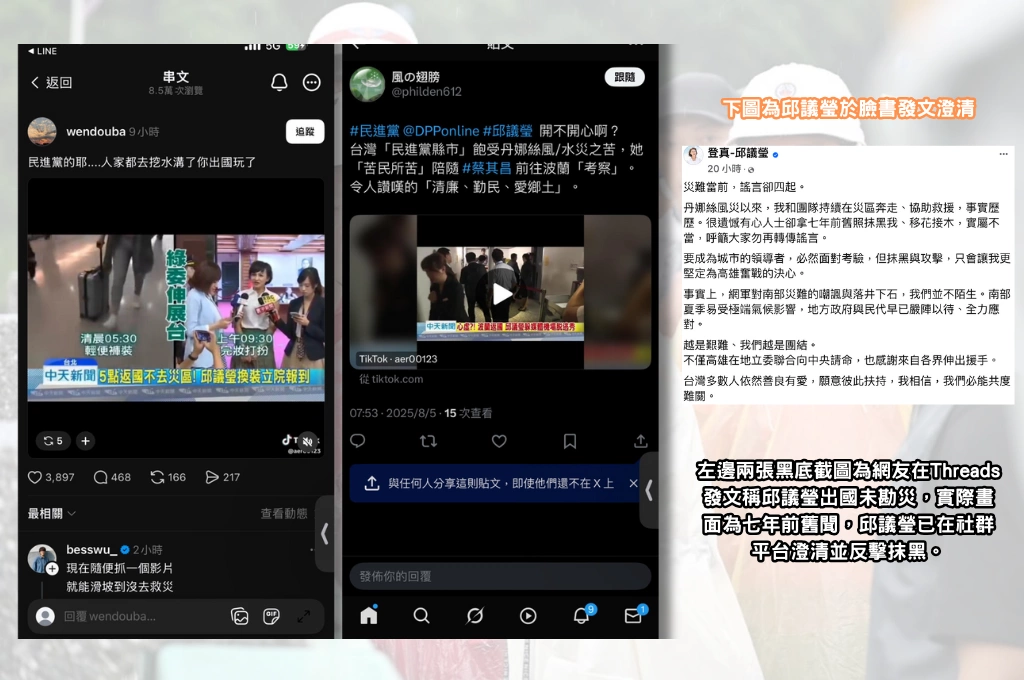 南部近日受丹娜絲颱風與西南氣流夾擊,高雄山區連日豪雨,多地災情嚴峻。然而,昨(5)日卻有不明帳號在社群平台 Threads 發文,指控民進黨立委邱議瑩「人在波蘭」,未投入救災。對此,邱議瑩澄清,該則新聞為2018年的舊聞,這次豪雨期間她都留在災區第一線協助救援。她痛批,有心人士拿七年前的舊照移花接木、製造對立,這種抹黑行徑無助於救災,並強調「越是艱難,我們越是團結」,呼籲民眾不要轉傳不實資訊。