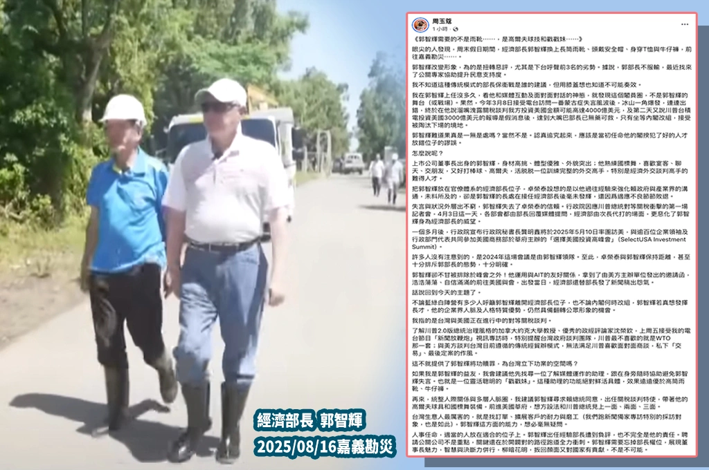 對於郭智輝近日舉動,周玉蔻表示,有眼尖的人發現,週末假日期間,郭換上長筒雨靴、頭戴安全帽、身穿T恤與牛仔褲,前往嘉義勘災。她指出,郭智輝改變形象,為的是扭轉惡評,尤其是下台呼聲前3名的劣勢,自己也聞聽到郭部長不願服輸,所以最近找來了公關專家協助提升民意支持度。