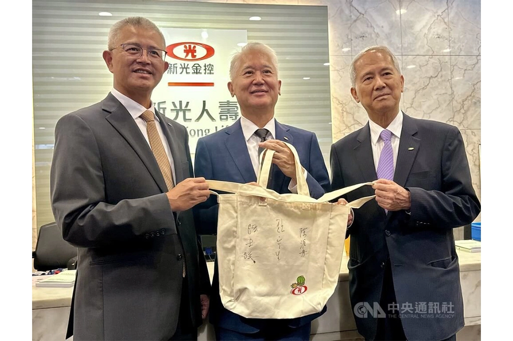 新光金2025年6月23日召開最後一場股東會,會後董事長魏寶生(中)、新光人壽副董洪士琪(左)、董事陳淮舟(右)於紀念品上簽名留念。