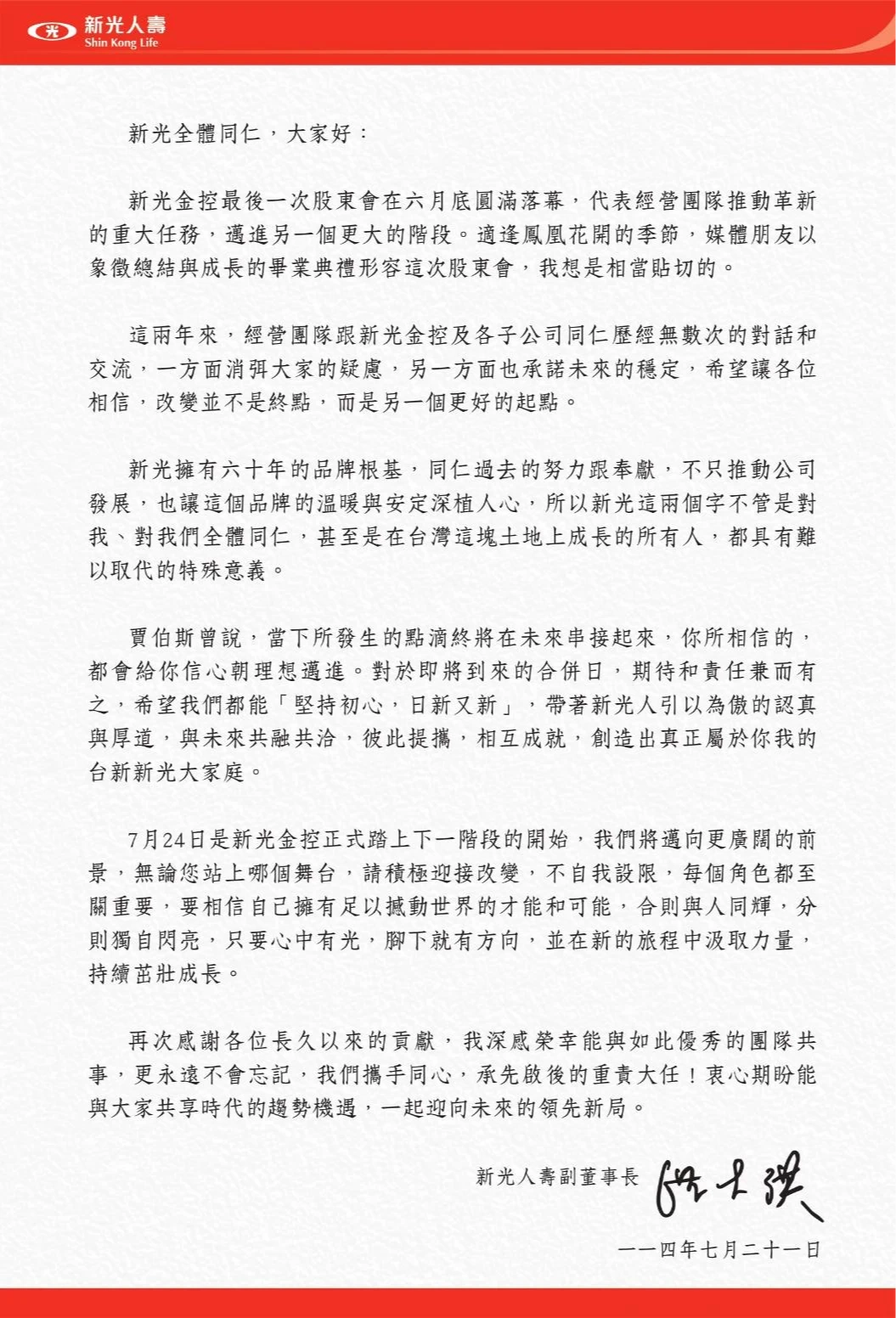 對洪士琪而言,這不只是一次股權與治理的整合,更是讓「新光」走出困局、走向新的開始。2025年7月21日,新新併前三日,他以新壽副董事長身分,寫下深情的一封內部信給員工們:「改變並不是終點,而是另一個更好的起點。」