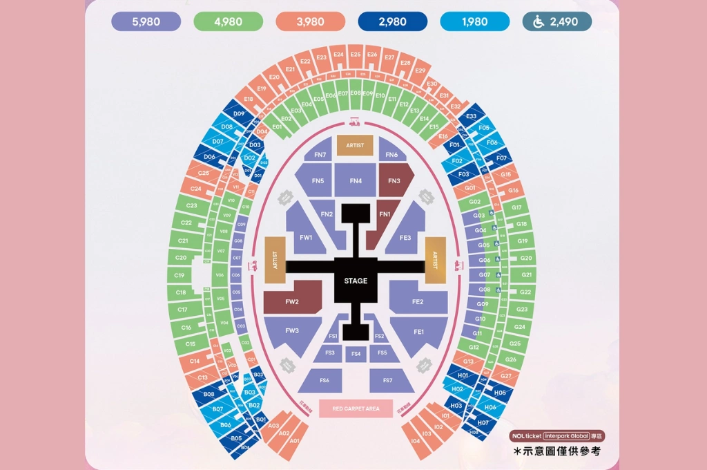 票價:NT$ 5,980 / 4,980 / 3,980 / 2,980 / 1,980 / 2,490(身障優惠票)(全區座席)