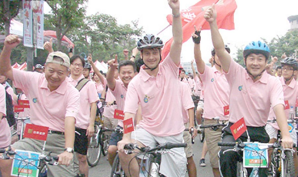 台新高層響應2007年的「大台北無車日活動」上街騎腳踏車,(前排左起)時任台新銀行總經理蔡孟峯、台新金營運長計葵生、台新金總經理林克孝。