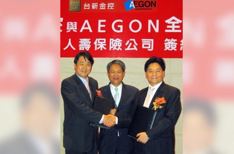 2007年6月8日,台新金宣布與全球人壽合資成立保險公司。(左起)台新金控總經理林克孝、台新金控董事長吳東亮、全球人壽總經理劉先覺一同合影。