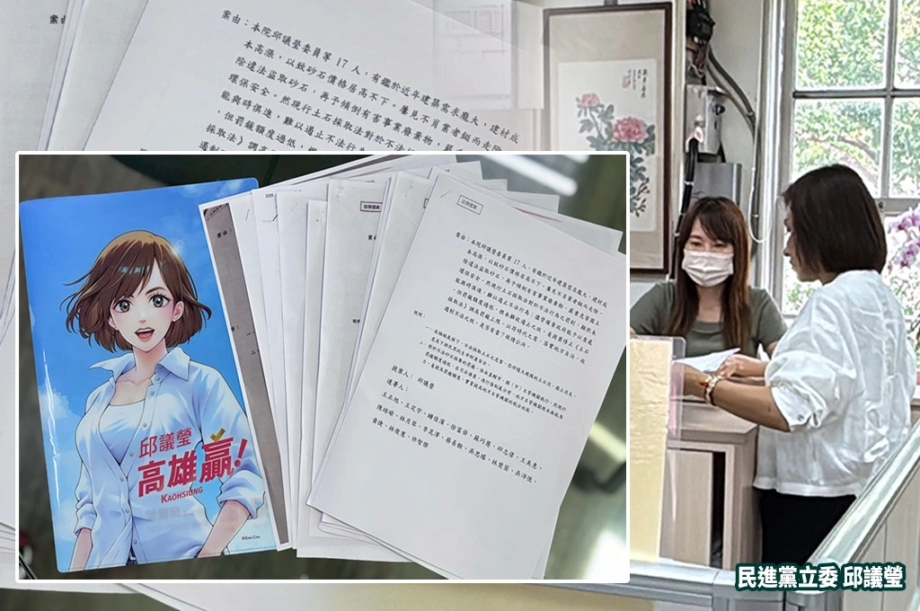 針對外界關注的美濃土石盜採案,民進黨立法委員邱議瑩今(18)日表示,已完成《土石採取法》修正案連署,率先將修正草案送入議事處,並透過三大重點「加重罰則、加重地主責任、斷絕運輸」,全面打擊不法砂石幫,盼進入審議程序後,不分黨派的委員都能一起支持,加速修法完成。