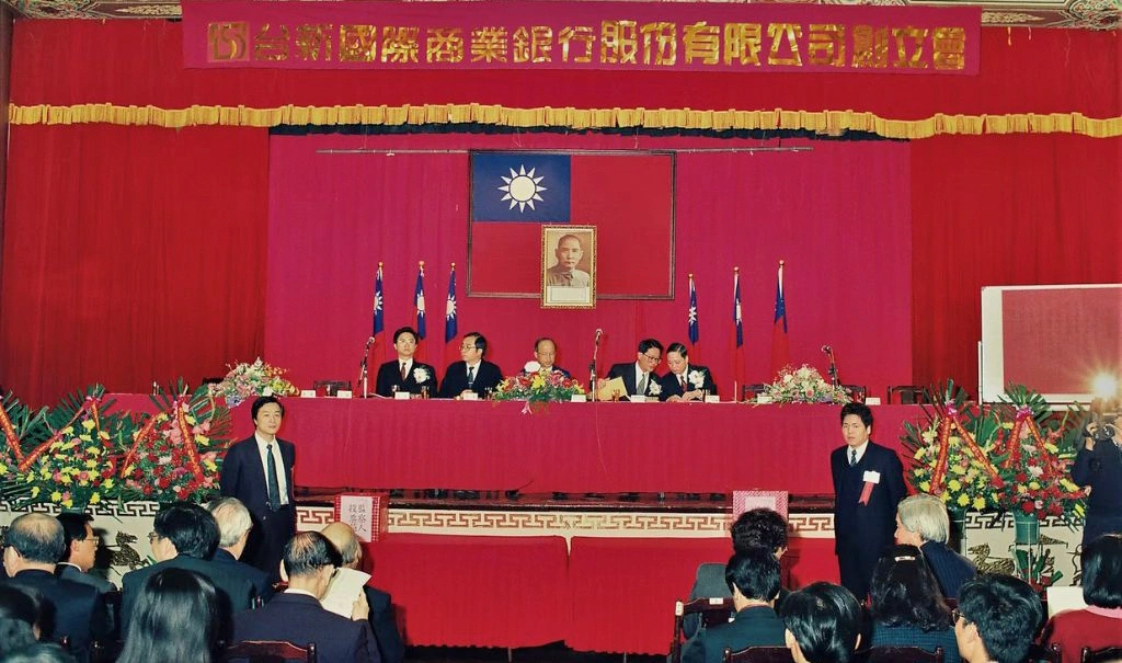 走進台新銀行開幕酒會會場,大廳張燈結綵,紅布條高掛,滿場賓客交談寒暄,洋溢著喜氣與隆重並存的氛圍。舞台後方矗立著鮮明的「台新銀行」標誌,兩側掛著「新銀行新希望」、「新銀行新方向」的大字標語,1992 年 3 月 23 日開業這天,宣示著一間新銀行的誕生,正好呼應著金融自由化時代的新氣象。