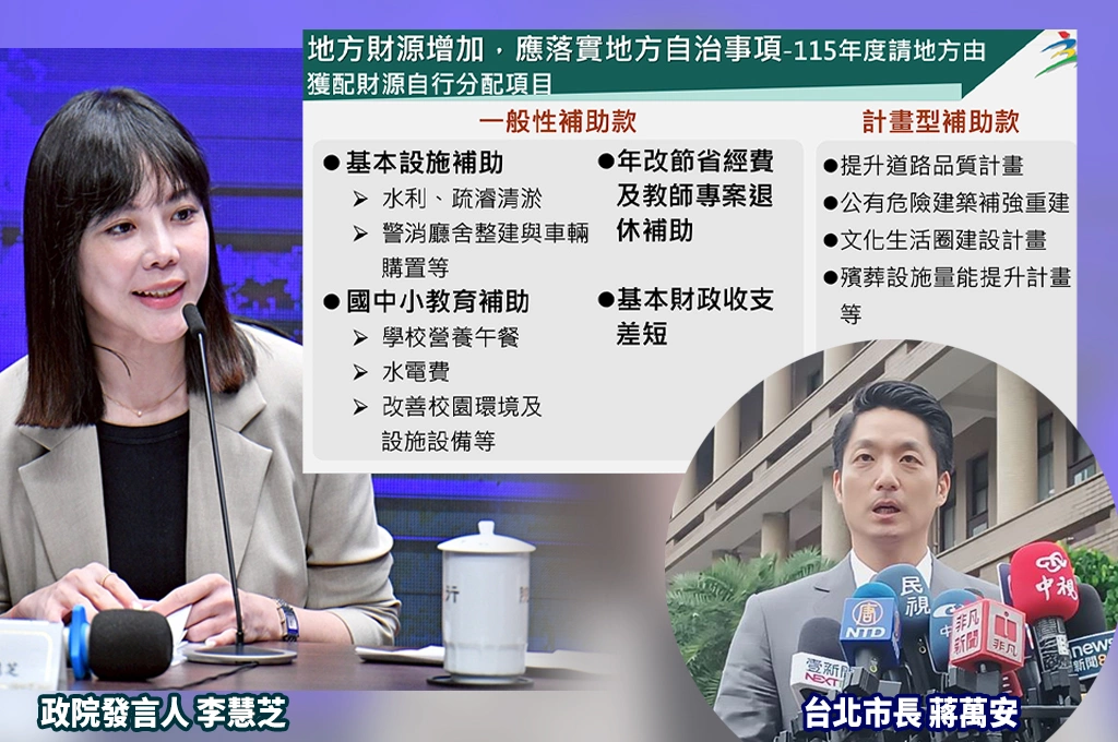 對此,行政院發言人李慧芝下午透過聲明回應,中央在財源大幅釋出後,明年地方的統籌稅款將增加4165億元,比今年成長達 89%;而為了確保地方可以妥善運用這筆大幅增加的財源,持續照顧民眾,也為了落實地方自治精神,相關事項需要回歸地方來辦理,包括道路修整、學校營養午餐以及校園水電費等等。
