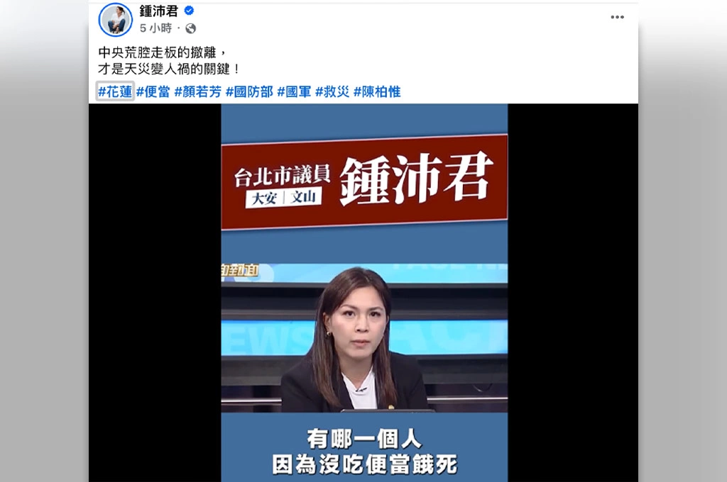 對此,鍾沛君今日並沒有道歉,甚至把這段言論剪成短影音貼上臉書,並說「中央荒腔走板的撤離, 才是天災變人禍的關鍵!」