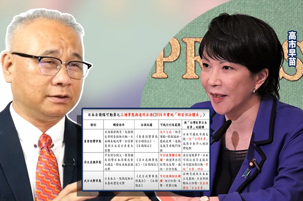 陳文甲說,高市早苗應該會延續這樣的認同,所謂的「台灣有事即日本有事」基本上是符合2016年實施的新安保法體制,當中分類三種影響事態:重要影響事態、存立危機事態、武力攻擊事態,如果台海發生衝突,美國會依臺灣關係法來介入,而日本也可按照「重要影響事態」依法後勤支援美國。