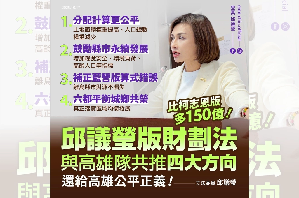 財政收支劃分法在時任國民黨智庫執行長柯志恩主導版本修法後,出現離島財源大減、算式錯誤等問題,其中高雄增幅更是六都最低僅49%,嚴重加劇南北失衡。對此,民進黨立委邱議瑩今(17)日與高雄隊立委賴瑞隆、許智傑、林岱樺、李柏毅、邱志偉、李昆澤、黃捷等人召開記者會,表示針對藍營柯志恩版本的缺失,已提修正案並送進議事處,透過四大方向補正漏洞,「比柯志恩版為高雄多爭取150億」,還給高雄應有的公平正義,呼籲關心高雄與自己家鄉的縣市立委,都能一起來響應、支持修法。