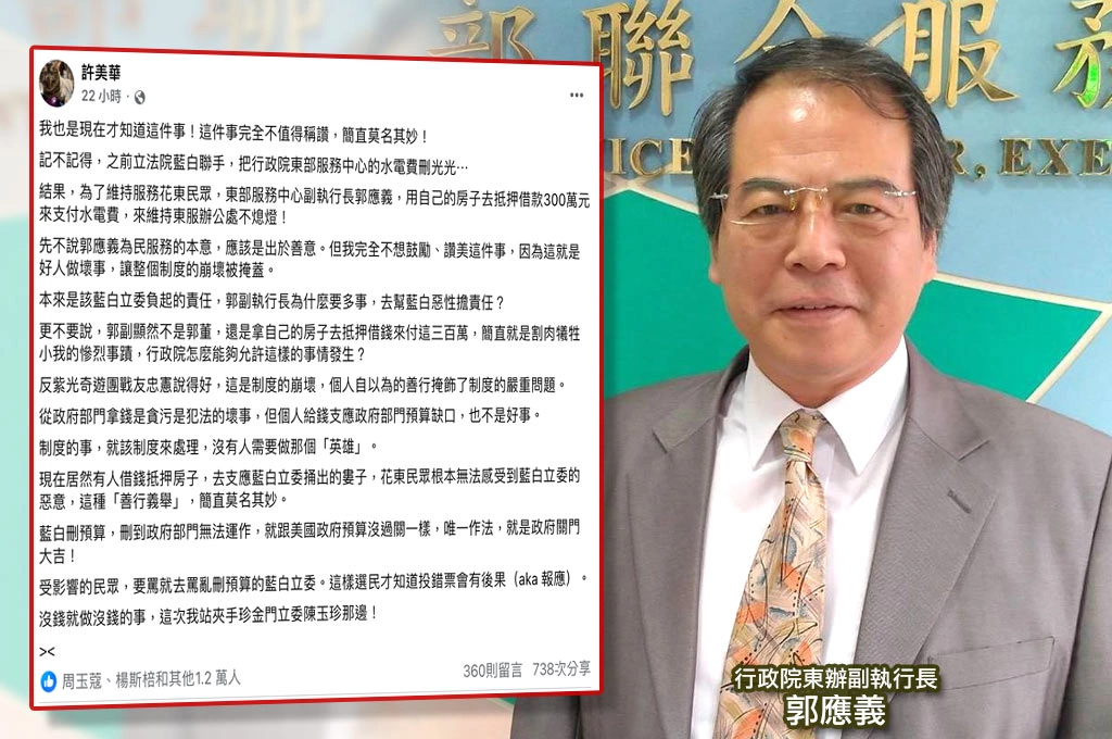 許美華嘆道,本來是該藍白立委負起的責任,郭副執行長為什麼要多事,去幫藍白惡性擔責任?更不要說,郭副顯然不是郭董,還是拿自己的房子去抵押借錢來付這三百萬,簡直就是割肉犧牲小我的慘烈事蹟,行政院怎麼能夠允許這樣的事情發生?