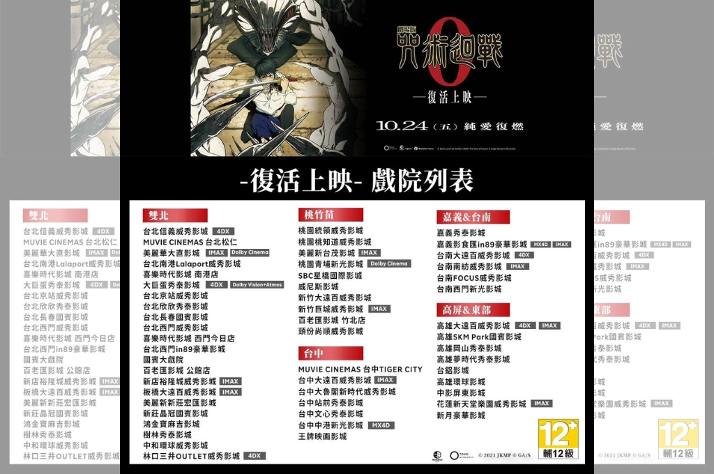 原作漫畫自2018年連載以來銷量突破6000萬冊,前傳《咒術迴戰 0》漫畫版亦掀起熱潮。為慶祝電視動畫開播五週年,劇場版《咒術迴戰 0》將於10月24日(五)重返大銀幕,帶來全新特典與多版本放映,包括IMAX、4DX、MX4D、Dolby Cinema、Dolby Vision+Atmos等影廳規格,讓粉絲再度回味乙骨與里香那段痛徹心扉、卻最溫柔的純愛。