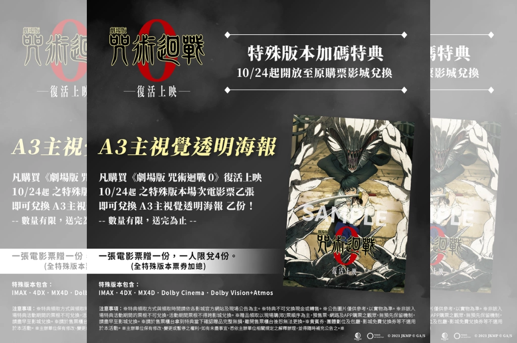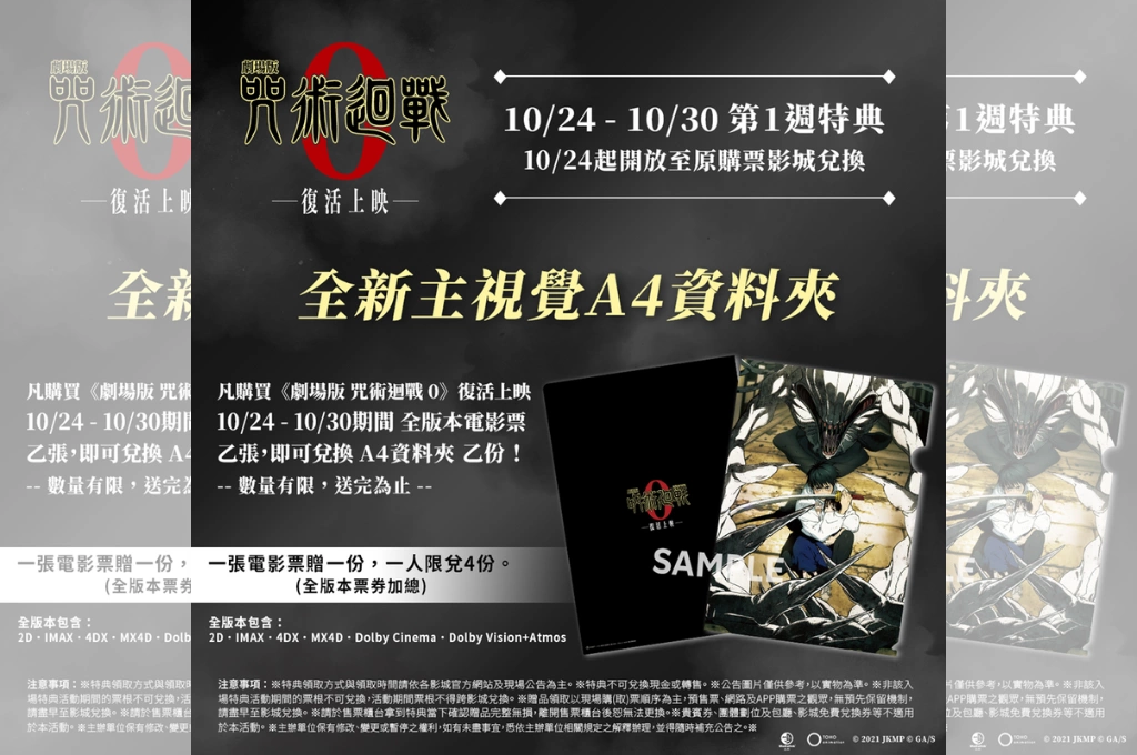 首週(10/24-10/30)凡購買電影票即可獲得「全新主視覺A4資料夾」乙份,而購買特殊版本(IMAX、4DX、MX4D、Dolby Cinema、Dolby Vision+Atmos)票券的觀眾,還能加碼兌換「A3主視覺透明海報」乙張。每張票可兌換一份特典,每人最多可兌換四份,數量有限、送完為止。羚邦表示特典將於上映首日同步開放兌換,粉絲若想完整收藏,建議盡早前往戲院領取,以免錯過。