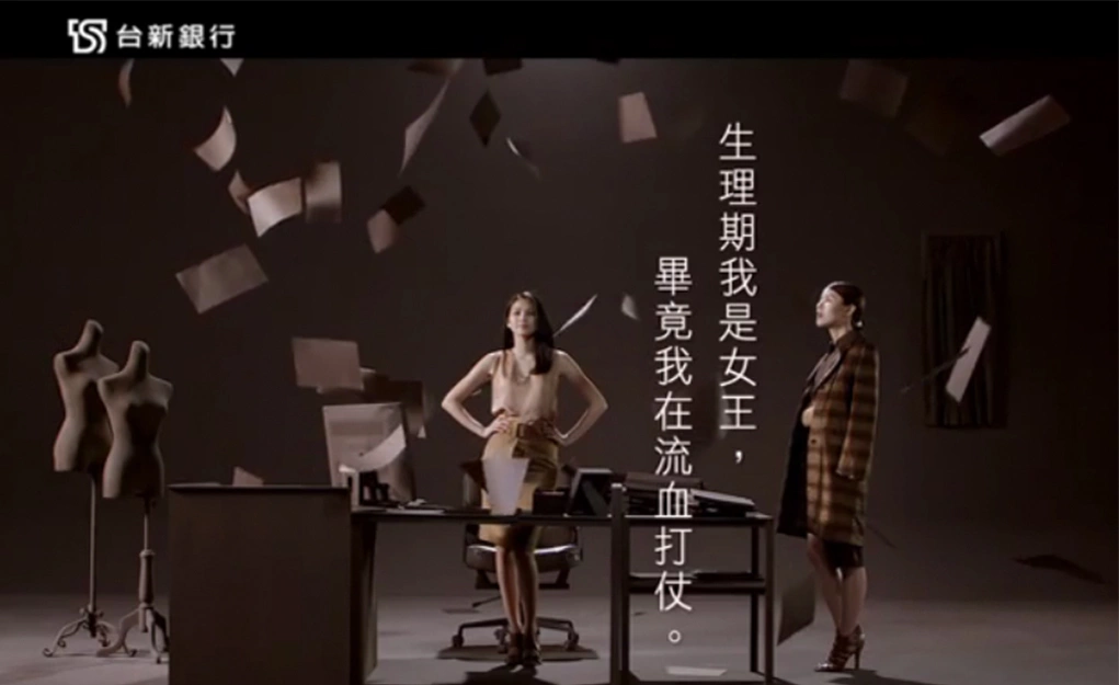台新銀行玫瑰卡2015年形象廣告《玫瑰女生-宣告篇》呈現女性在生理期中的職場日常。