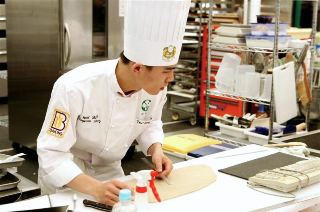 2007年,武子靖代表台灣出戰國際技能競賽「麵包製作」,比賽現場聚精會神製作麵包的畫面。(圖|勞動部提供)